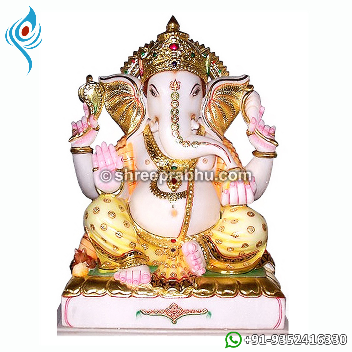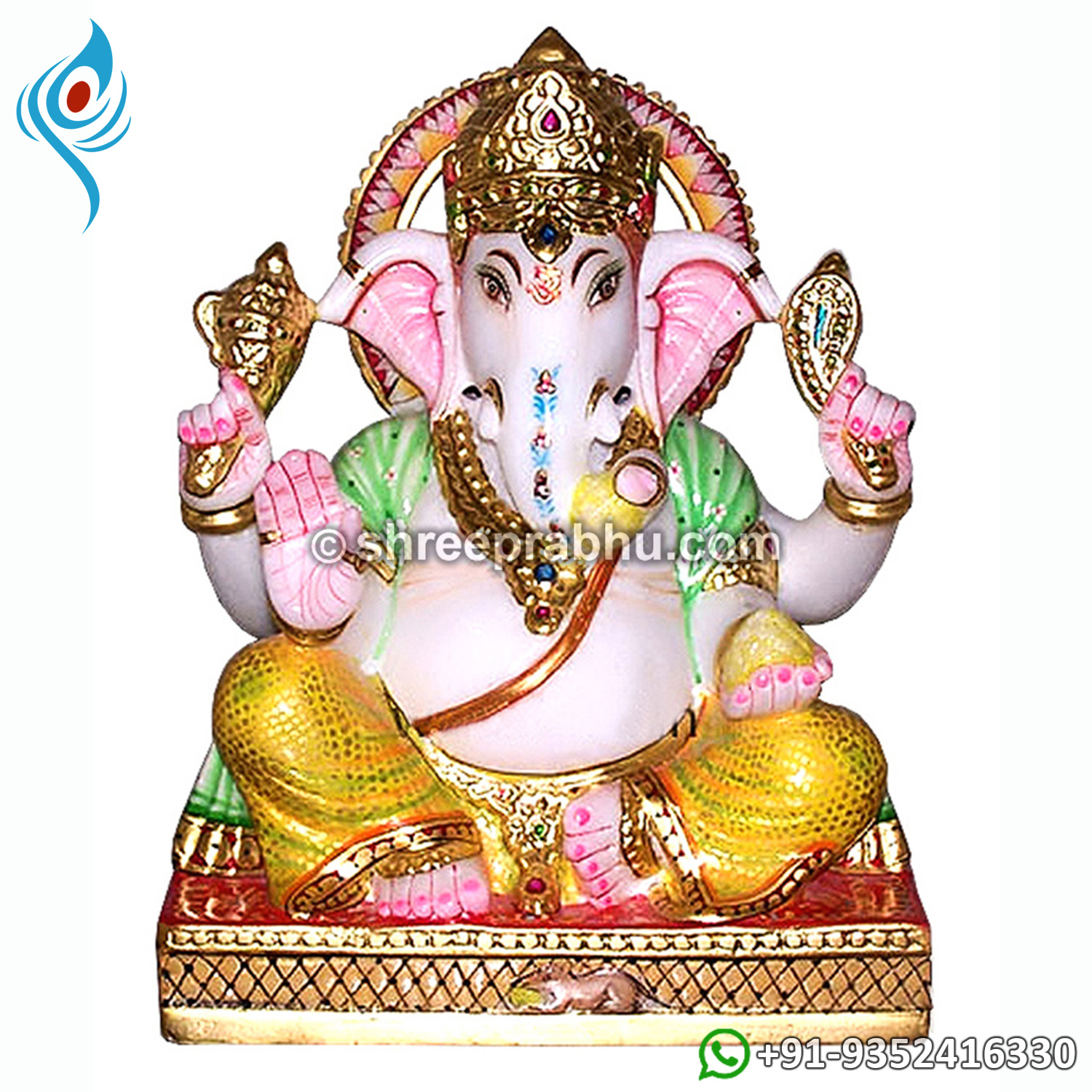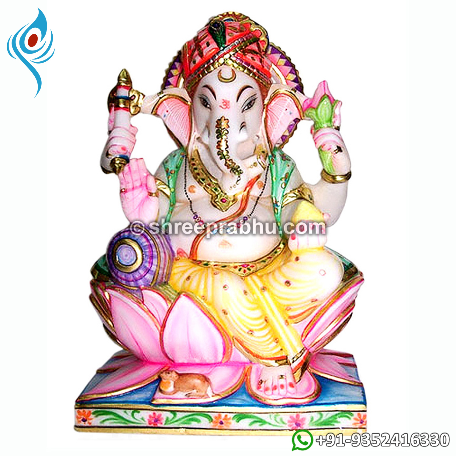 This stunning Marble Ganesha Murti is a vibrant and artistically crafted representation of Lord Ganesha, designed to bring joy, prosperity, and divine blessings into your home. Made from premium quality white marble, the idol features rich hand-painted detailing with a striking red turban, golden attire, and intricate embellishments that enhance its festive and royal appeal. Lord Ganesha is gracefully seated on a beautifully carved pink lotus base, symbolizing purity, enlightenment, and spiritual growth. His blessing hand offers protection and positivity, while the modak signifies abundance and fulfillment in life. The finely detailed crown, ornaments, and expressive facial features reflect exceptional craftsmanship. The presence of Mooshak (the mouse) adds traditional significance. Ideal for home temples, festive décor, spiritual spaces, and auspicious gifting, this murti is believed to remove obstacles and attract happiness, success, and positive energy. A perfect blend of devotion and artistry, handcrafted by Shree Prabhu Jaipur.