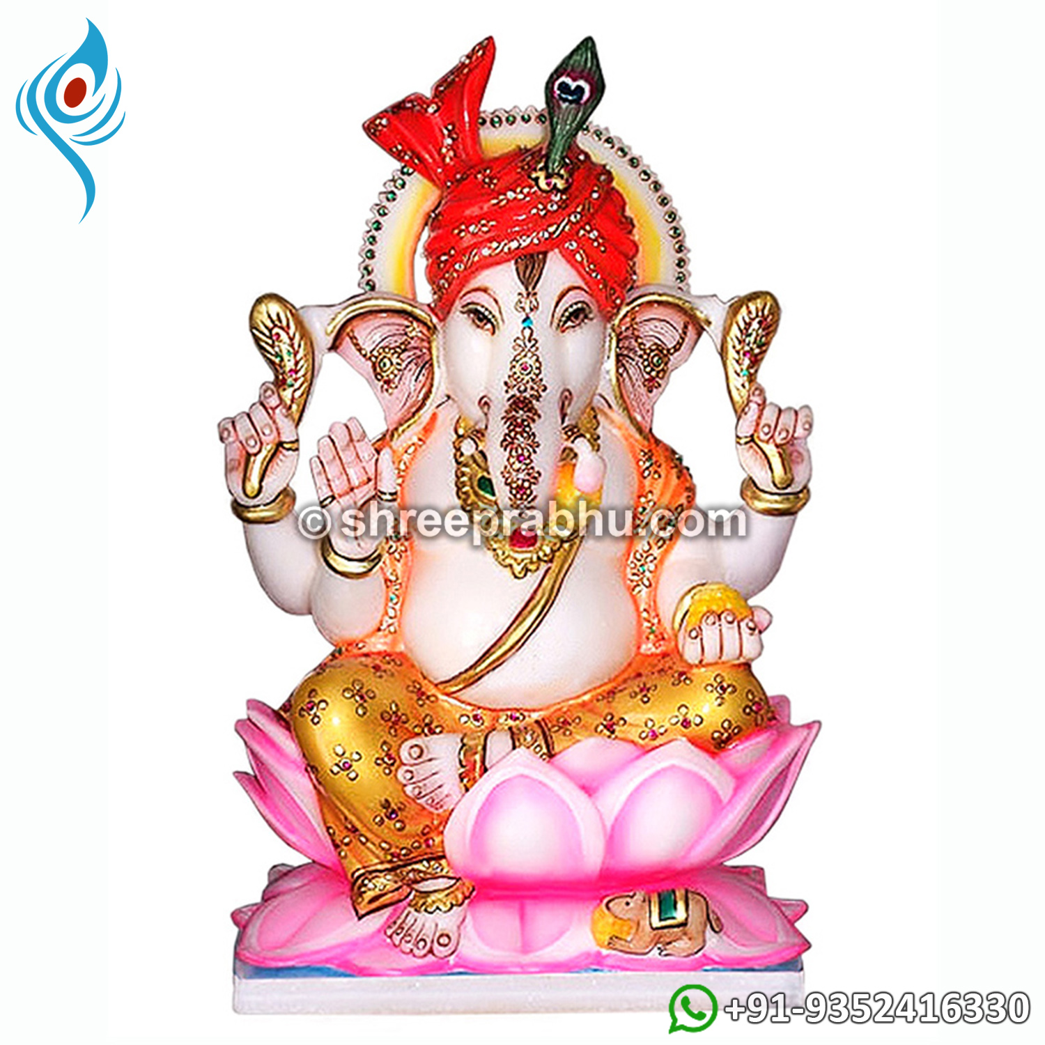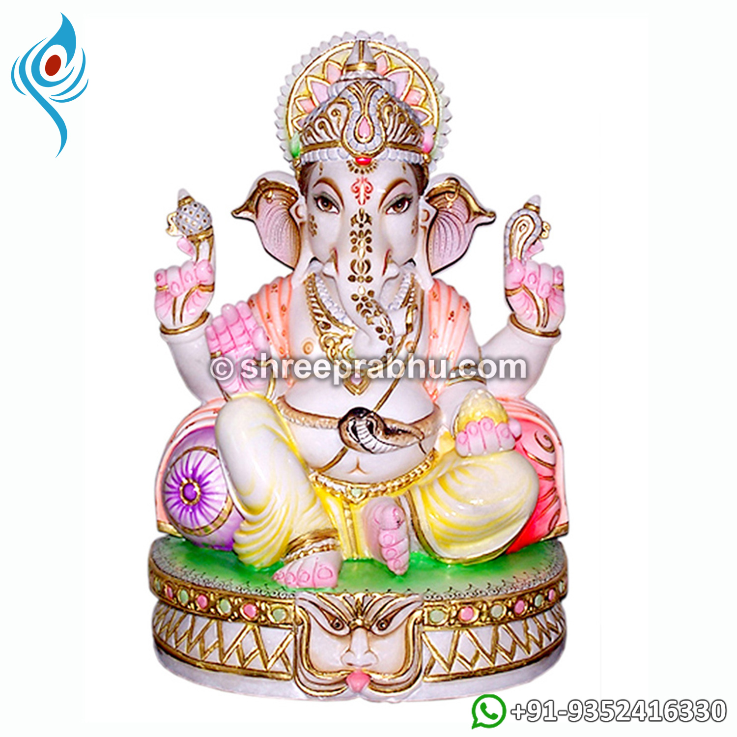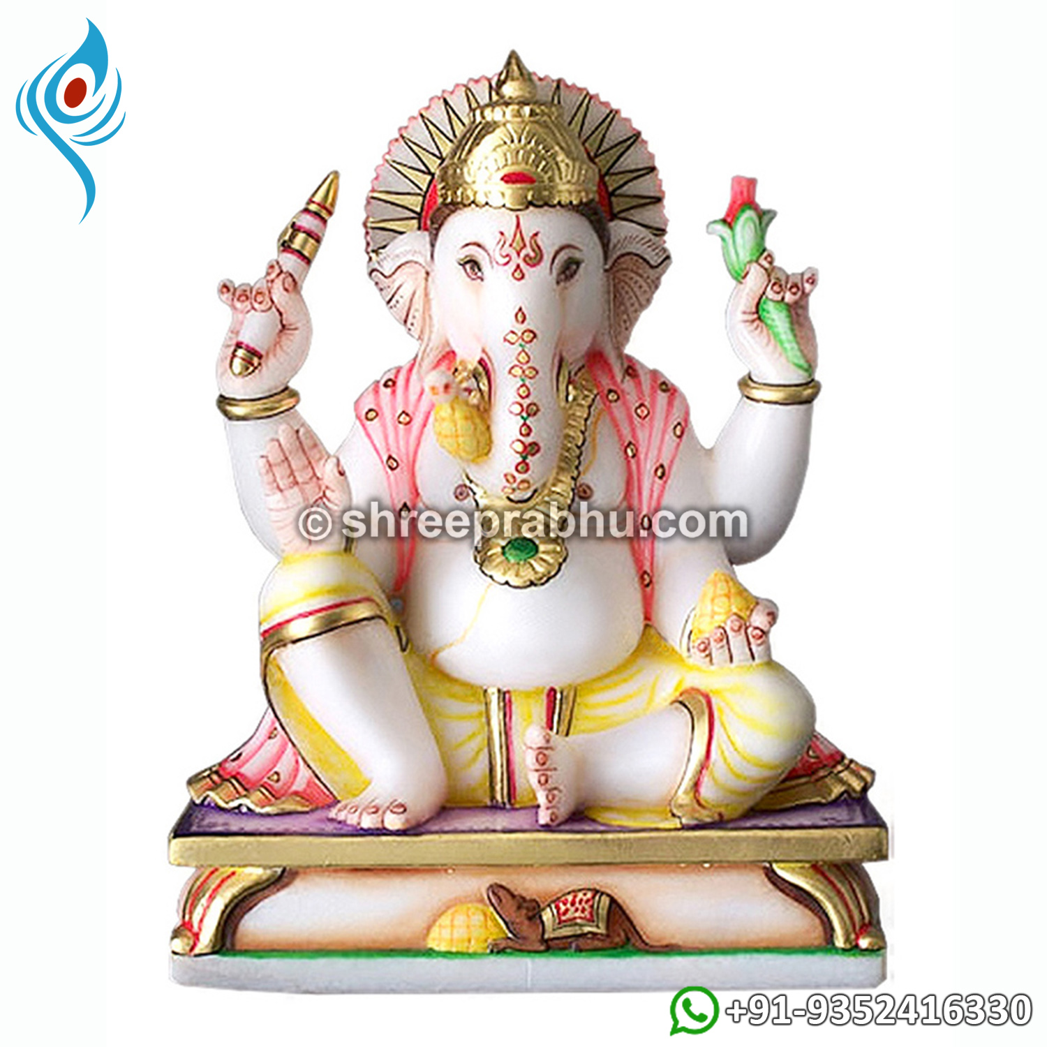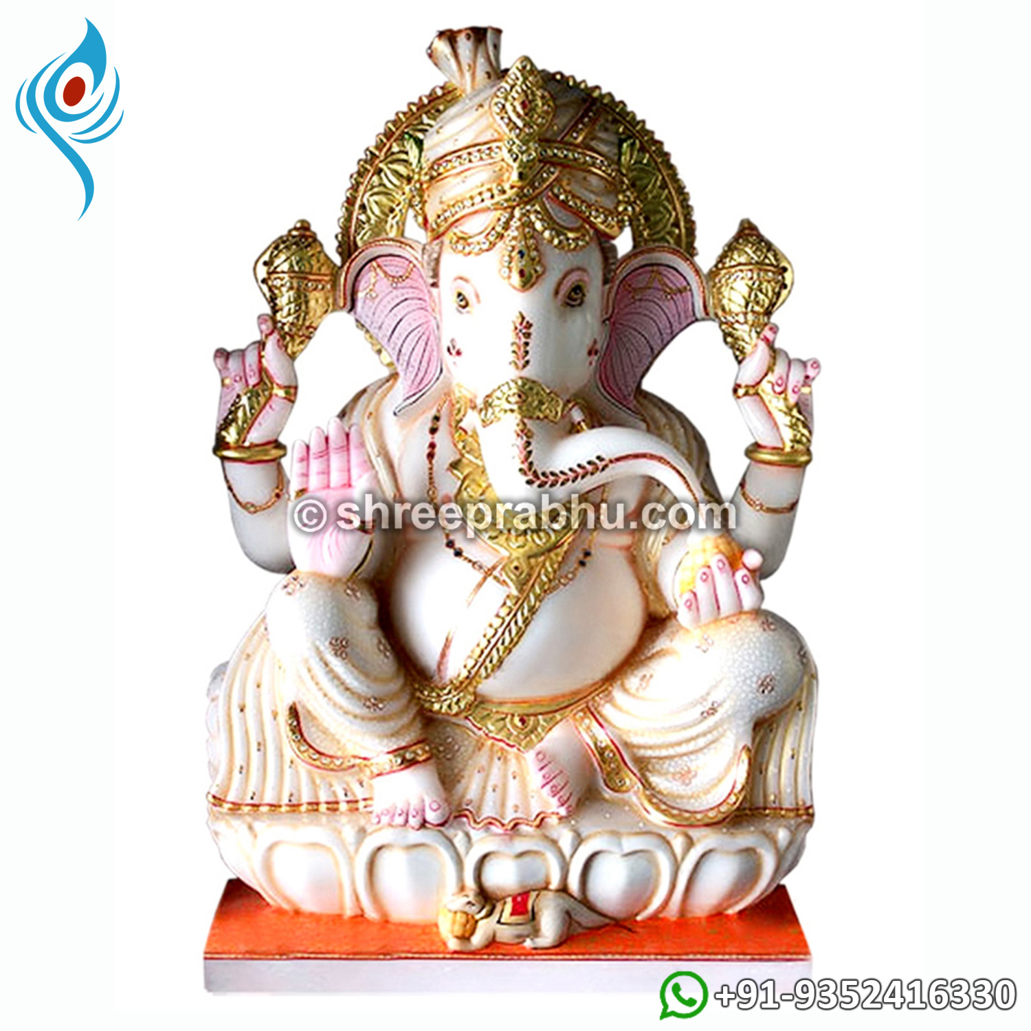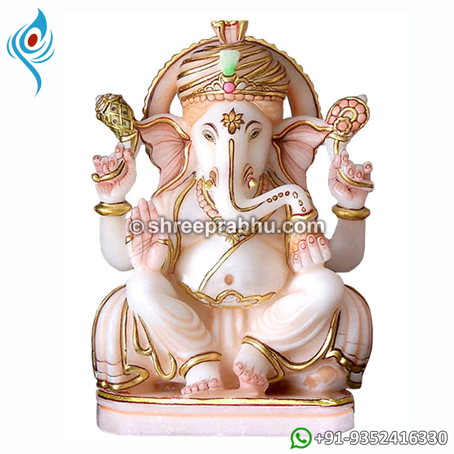 This elegant Small Marble Ganesh Idol is a perfect blend of compact design and divine beauty, crafted to bring blessings and positivity into any space. Made from high-quality white marble, this idol is adorned with intricate golden detailing and delicate hand-painted accents that enhance its spiritual charm. Lord Ganesha is depicted in a serene seated posture with finely carved ornaments, a detailed crown, and expressive features that reflect skilled craftsmanship. Despite its smaller size, the idol beautifully captures symbolic elements like modak and blessing hand gestures, representing prosperity, protection, and success. Ideal for home temples, office desks, small पूजा spaces, car dashboards, and gifting, this murti is believed to remove obstacles and attract peace and good fortune. A graceful and meaningful creation, thoughtfully handcrafted by Shree Prabhu Jaipur.